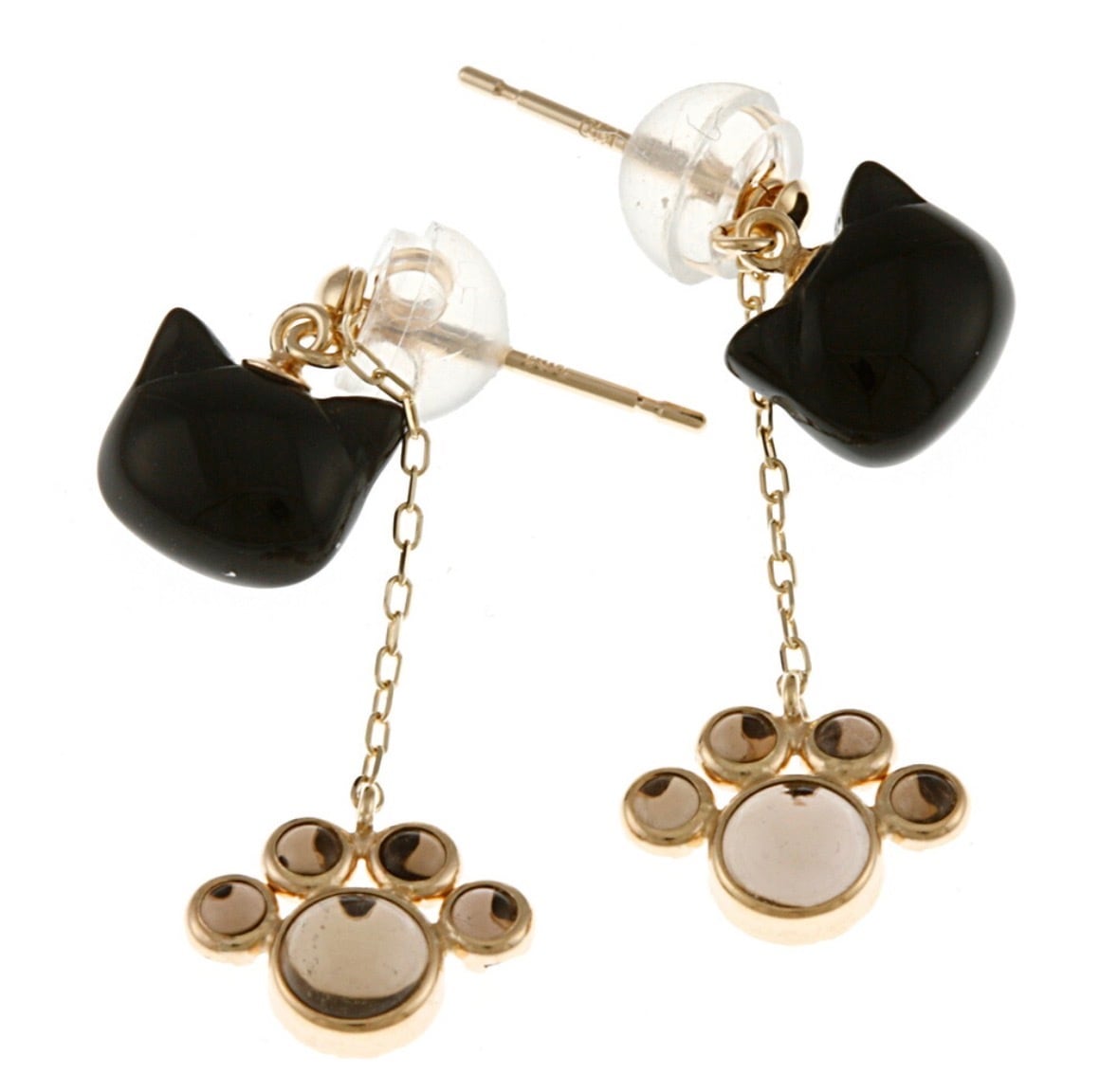 K10 ピアス 猫 肉球 オニキス スモーキークォーツ 揺れる 10金 刻印あり